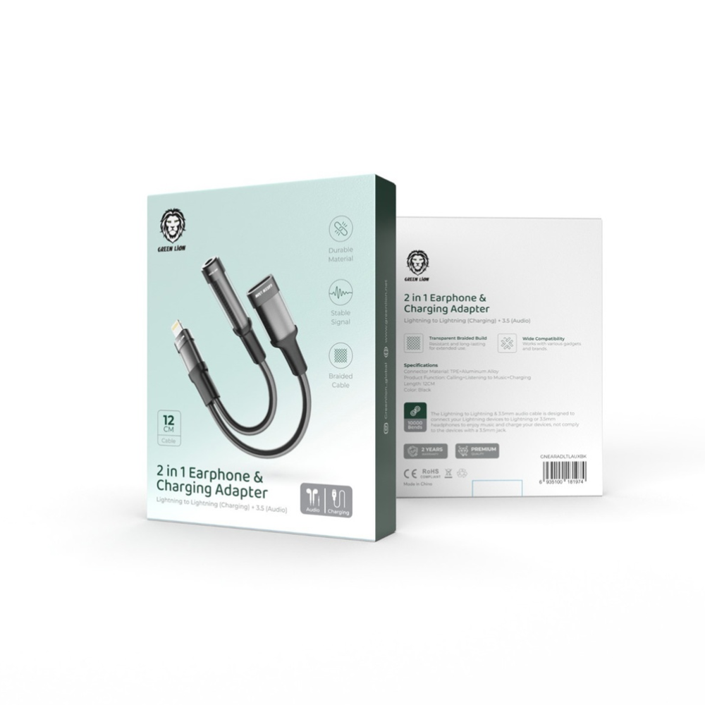 Green Lion 2 in 1 Earphone & Charging Adapter Lightning to Lightning + 3.5 12CM -Black